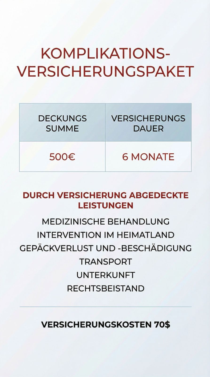 In Zusammenarbeit mit einem Gesundheitstourismus-Versicherungsanbieter stellen wir sicher, dass Sie sich keine Sorgen um zusätzliche Kosten machen müssen. Wir bieten Schutz vor möglichen Komplikationen nach einer Beinverlängerungsoperation.